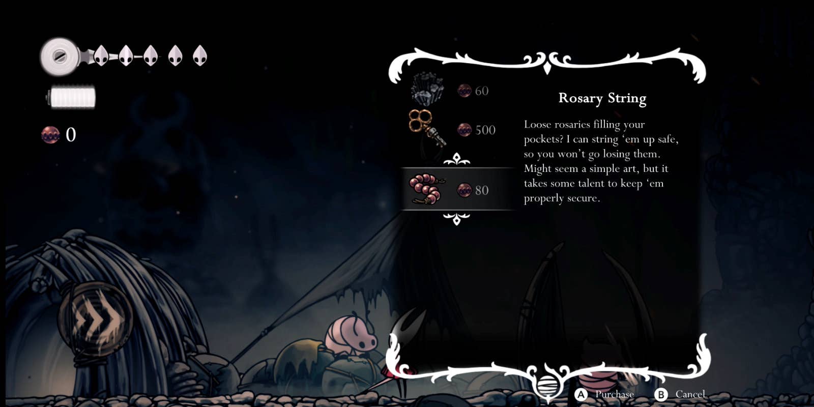 К счастью, есть способ защитить хотя бы розарии. Некоторые торговцы предлагают превратить 80 свободных бусин в нитку розария, которая не теряется при смерти Hornet. Минусы в том, что нитку нужно разорвать, чтобы потратить бусины, и не только торговцы, включая Шакру, предлагают опцию нитки розария. Тем не менее это полезный способ защитить валюту.