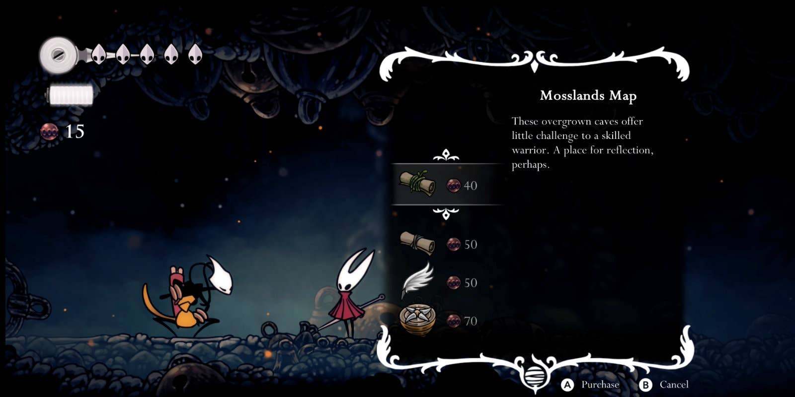 Как и в других метроидваниях, Silksong — это про исследование. Но в отличие от многих других метроидваний, карту нужно покупать у торговца Шакры, а также покупать другие предметы, позволяющие видеть своё положение на карте, заполнять её дальше или оставлять маркеры. Рекомендуется потратить немного времени в начале на фарм розариев, чтобы купить все эти предметы — это значительно упростит исследование по мере продвижения.