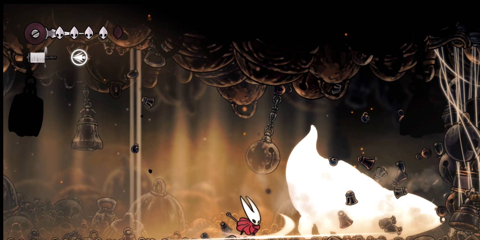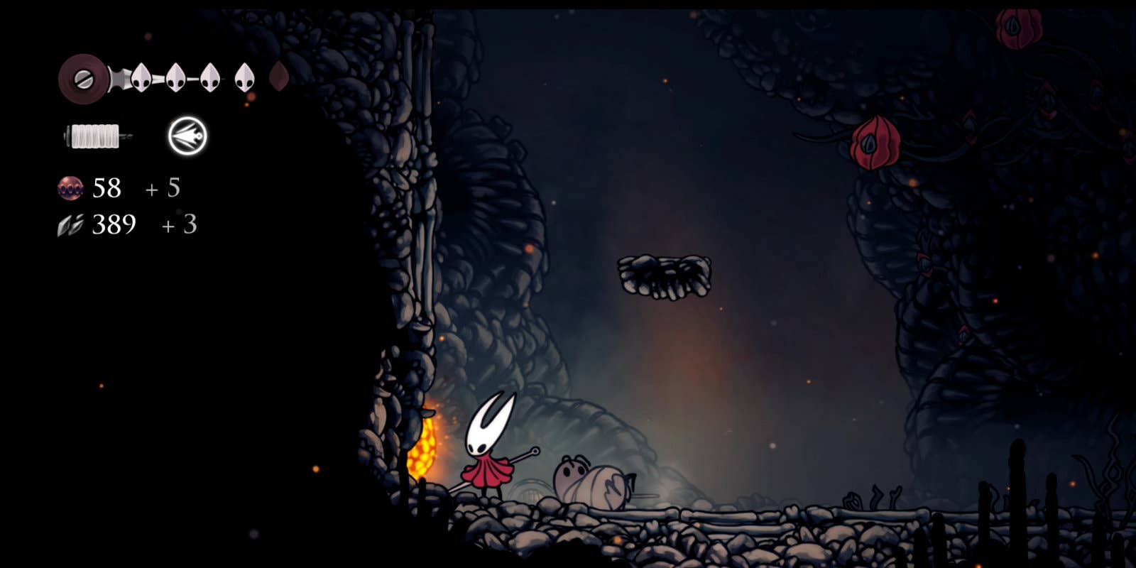 Так же, как и в Hollow Knight, Silksong полна скрытых путей и небольших бонусов, спрятанных за ломаемыми стенами. Две из них находятся довольно рано в игре: первая — чуть выше передвижного цирка блох (влево и вверх) и прячет 25 розариев, а вторая — на верхнем экране Bone Bottom, слева от места, где вы получаете своё первое улучшение Ткачихи.