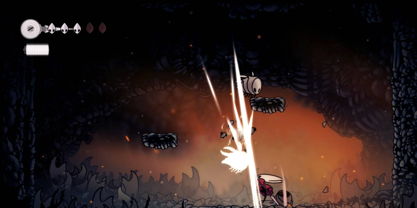 Иногда по визуальным эффектам можно понять, что стена ломаемая, иногда — нет: обычно безопаснее просто бить по каждому подозрительному отрезку стены, чтобы узнать, можно ли пробить путь. Вас могут даже вознаградить за последовательный брейк (как секретная тропа в Deepnest в Hollow Knight).