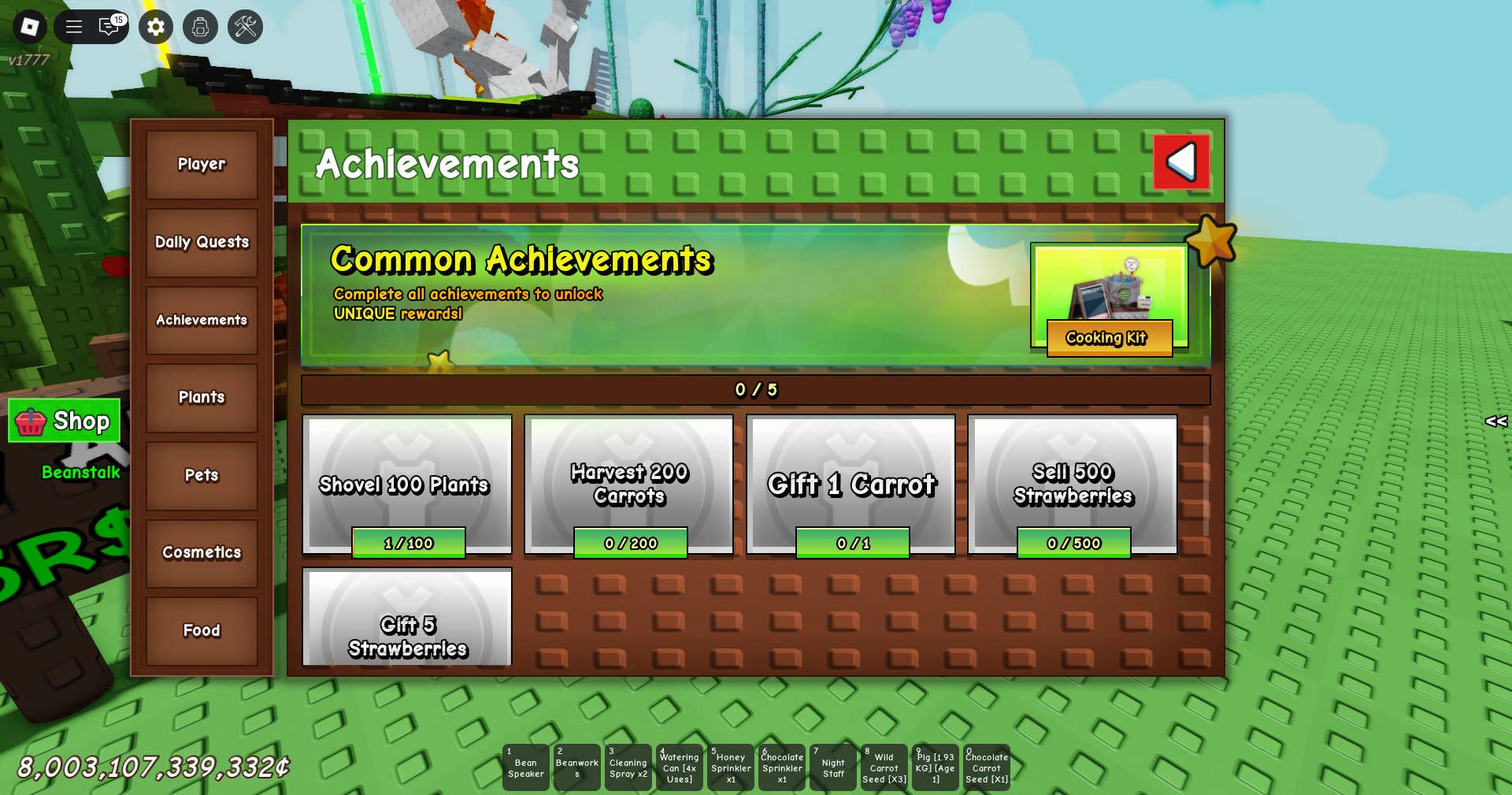 Чтобы готовить в Grow a Garden, вам нужно разблокировать Кулинарный набор, выполнив все достижения одного типа: Обычные, Редкие или Мифические. Рекомендую сосредоточиться на Обычных достижениях — их выполнить намного легче. (Надеюсь, вы любите выращивать морковь…)