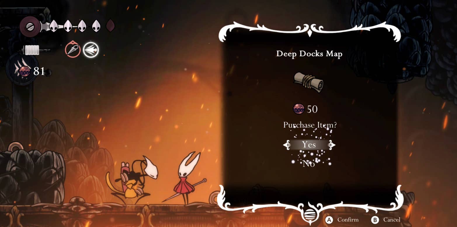 Наконец, когда вы действительно купите карту, вы можете заметить, что она выглядит несколько пустой. Дело в том, что в Silksong вам нужно дополнительно покупать у Шакры предметы, которые делают карту действительно пригодной для использования!