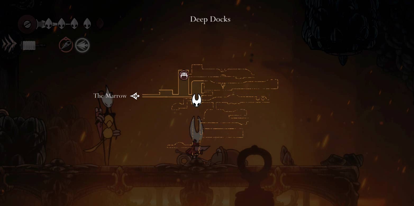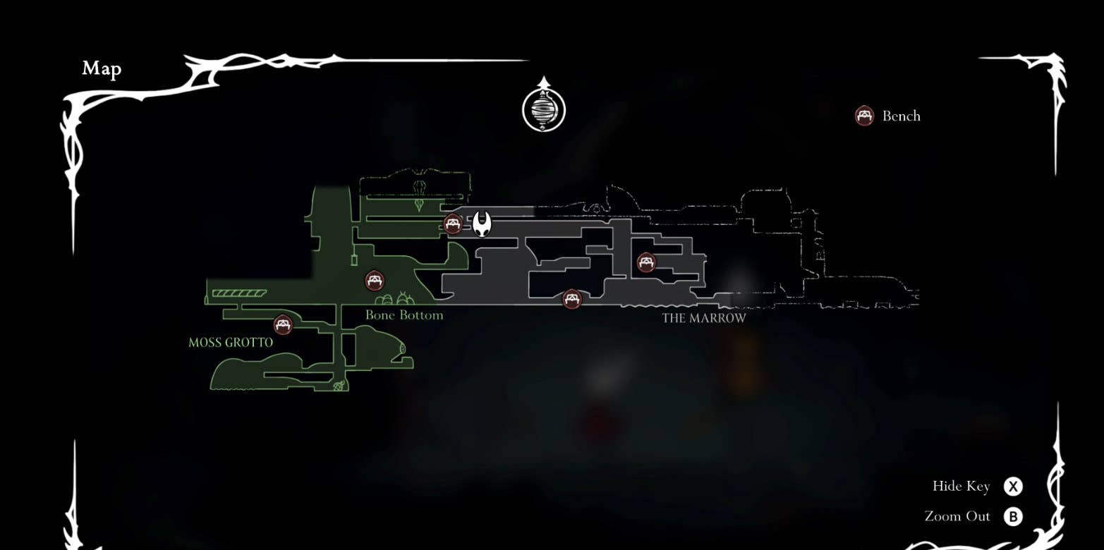 Здесь видно разницу между нашей исследованной картой The Marrow и неисследованной картой Deep Docks. Пора присесть на скамью! | Image credit: Eurogamer/Team Cherry