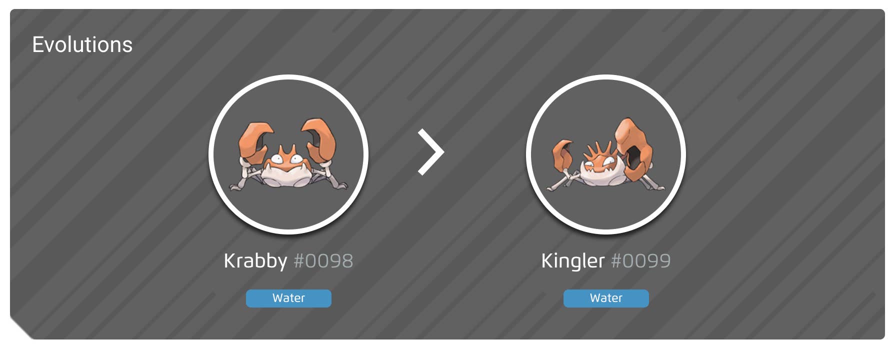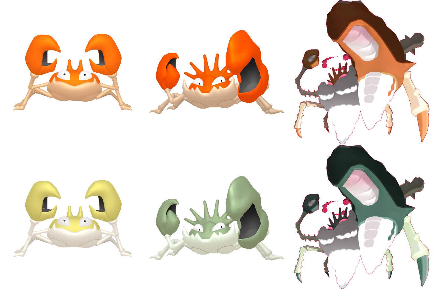 Как видно ниже, shiny Krabby пошёл по «давайте сделаем всё зелёным» пути среди блистящих вариаций 1‑го поколения. В то время как обычная линия Krabby — традиционно оранжево‑кремовая (как настоящие крабы), shiny Krabby — почти бледно‑жёлто‑зелёный. Shiny Kingler же — тёмно‑зелёный оттенок, который больше не похож ни на одно животное на Земле. Может быть, это защитный механизм — мы настоятельно не советуем есть краба, который стал зелёным…