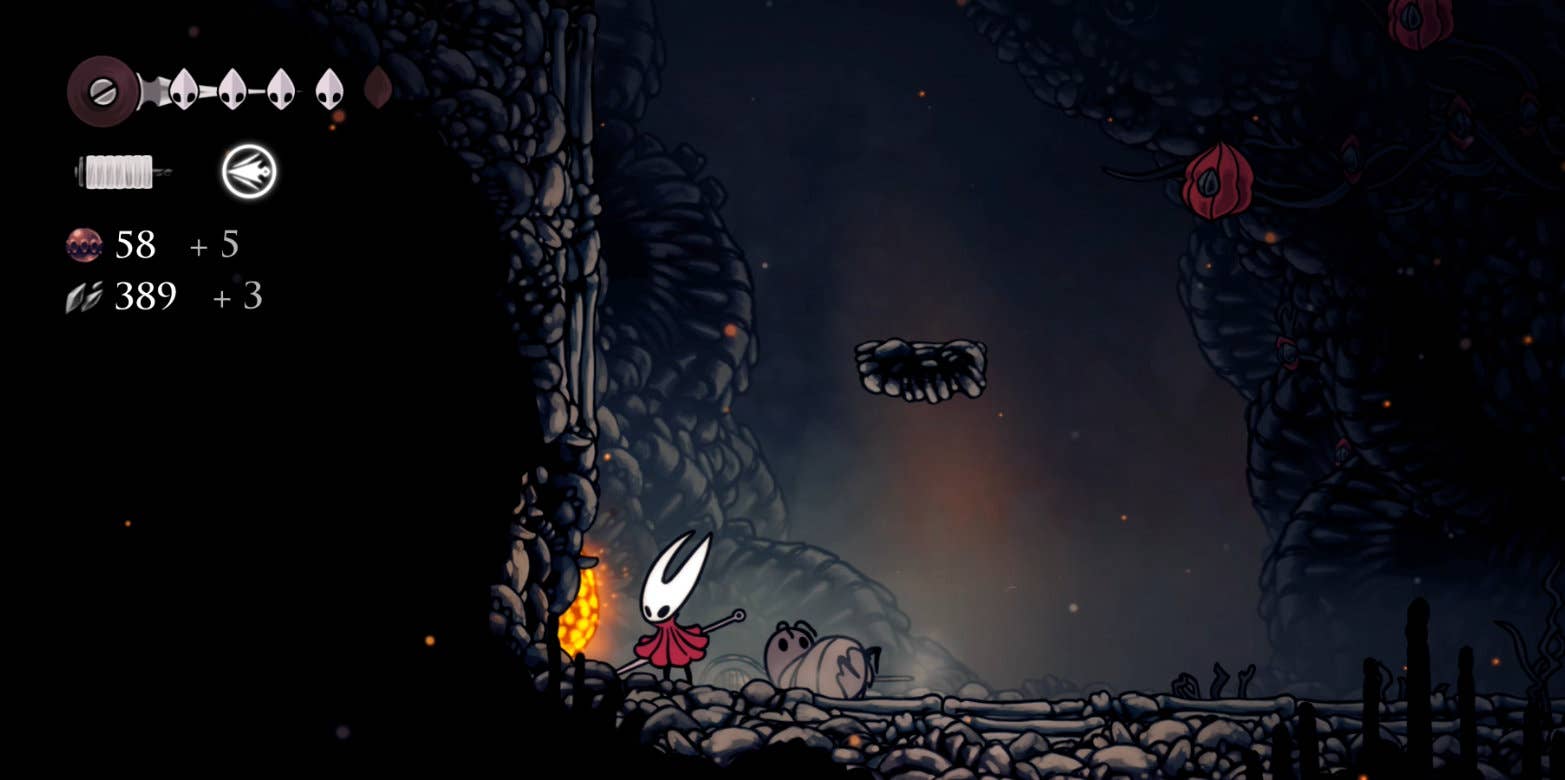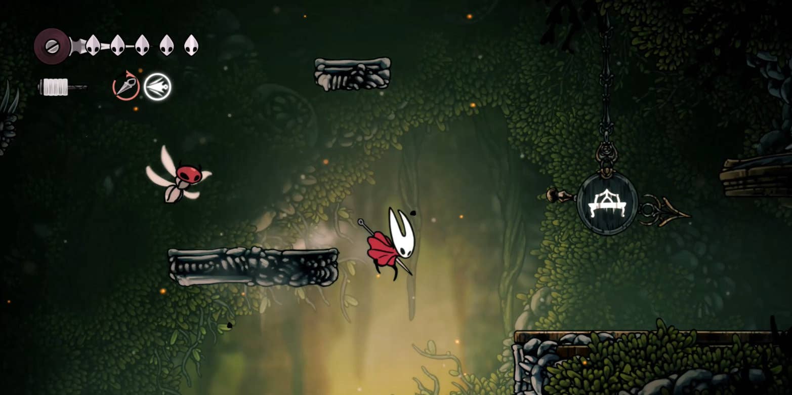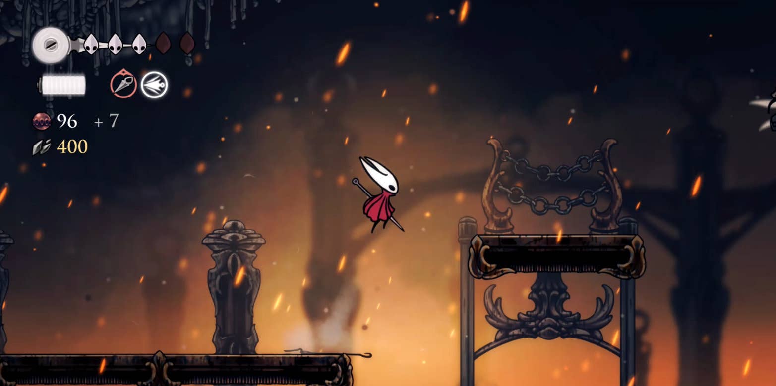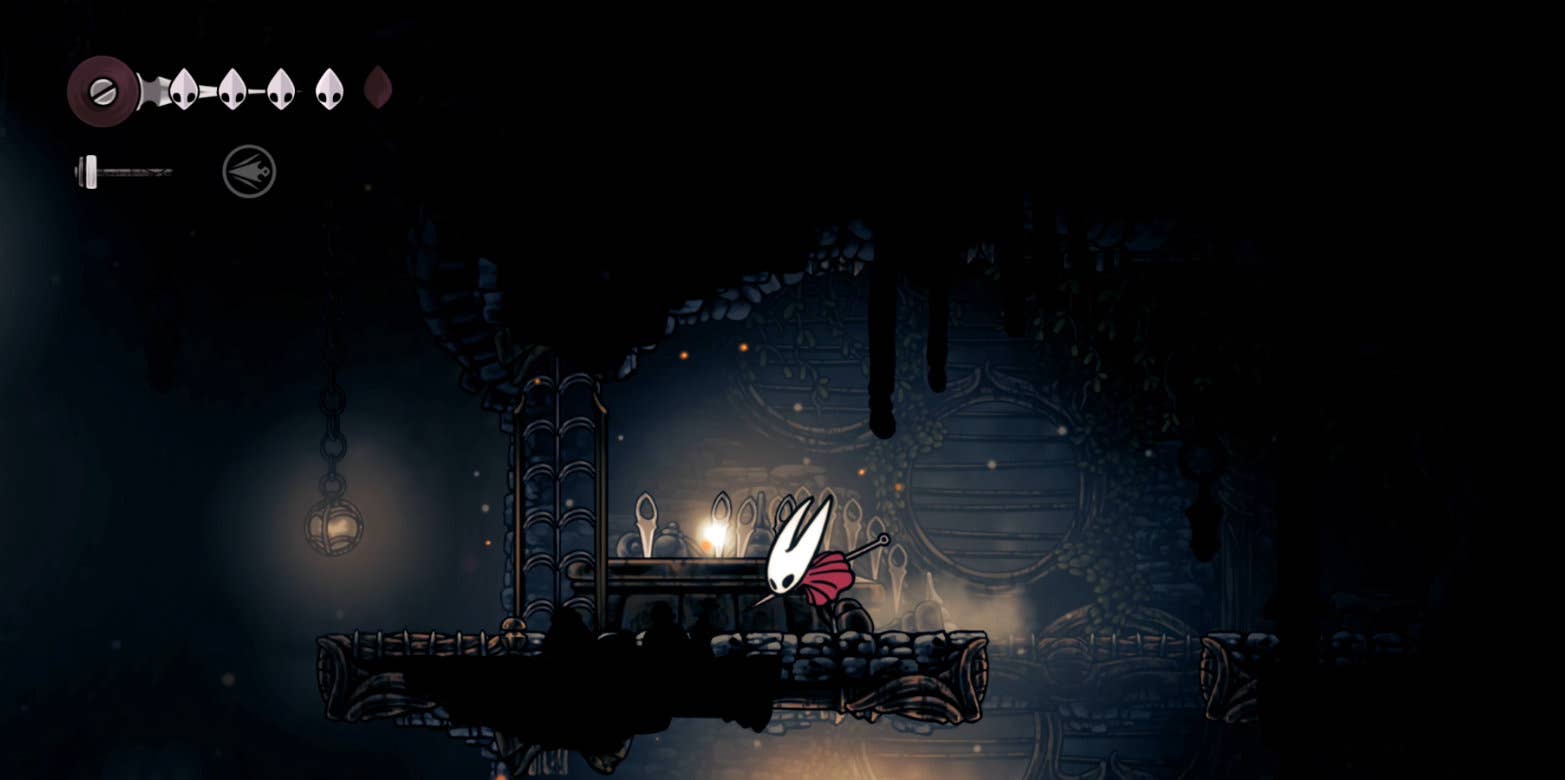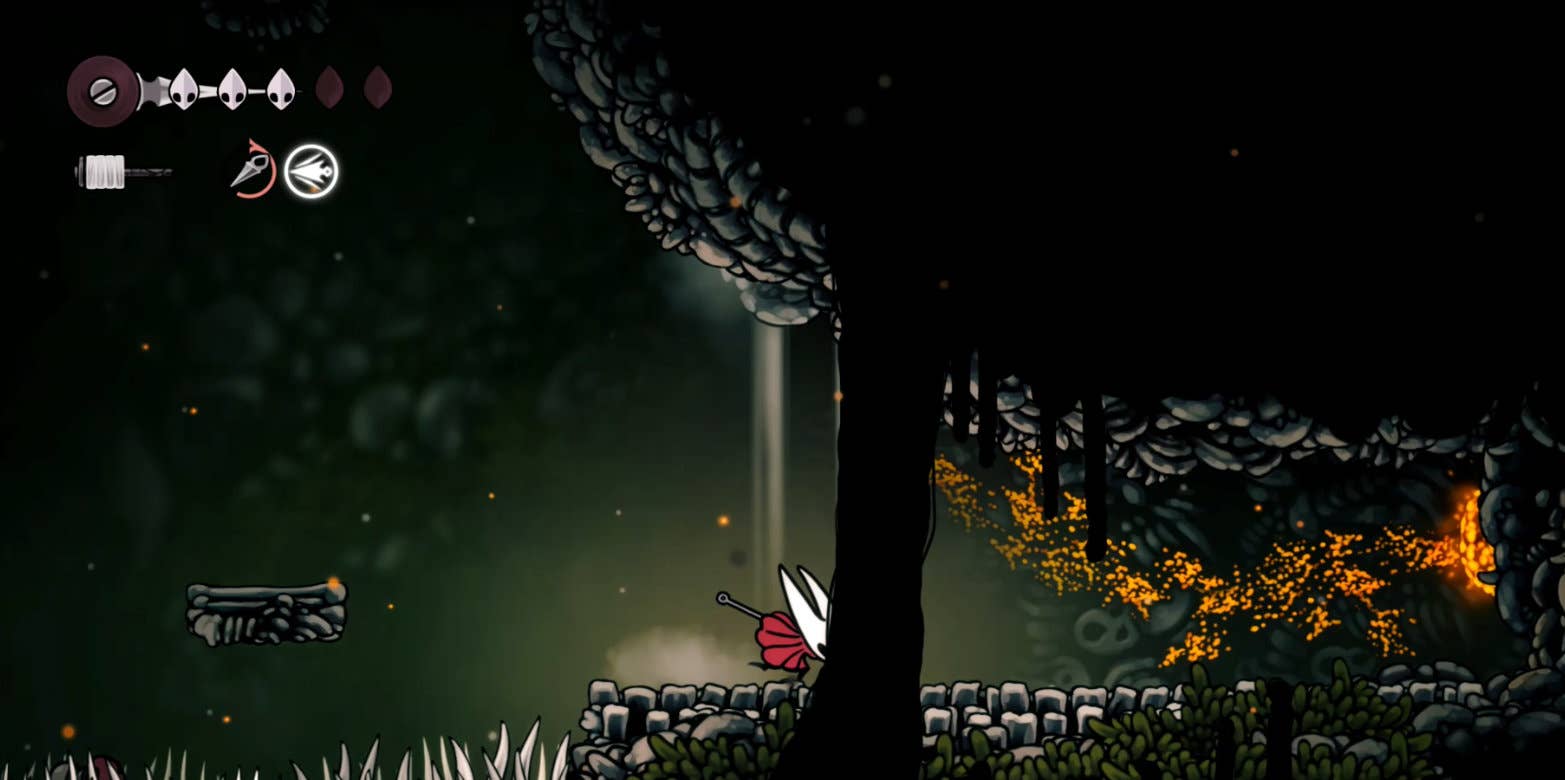 Следующая область начинается секцией с шипами, которую нужно пройти, перепрыгивая с платформы на платформу. Учтите, что эти платформы исчезают вскоре после приземления, так что действуйте быстро. Двигайтесь вперёд, избегая шипов и собирая любые Розарии (Rosaries), которые встретите, пока не дойдёте до конца этой зоны.