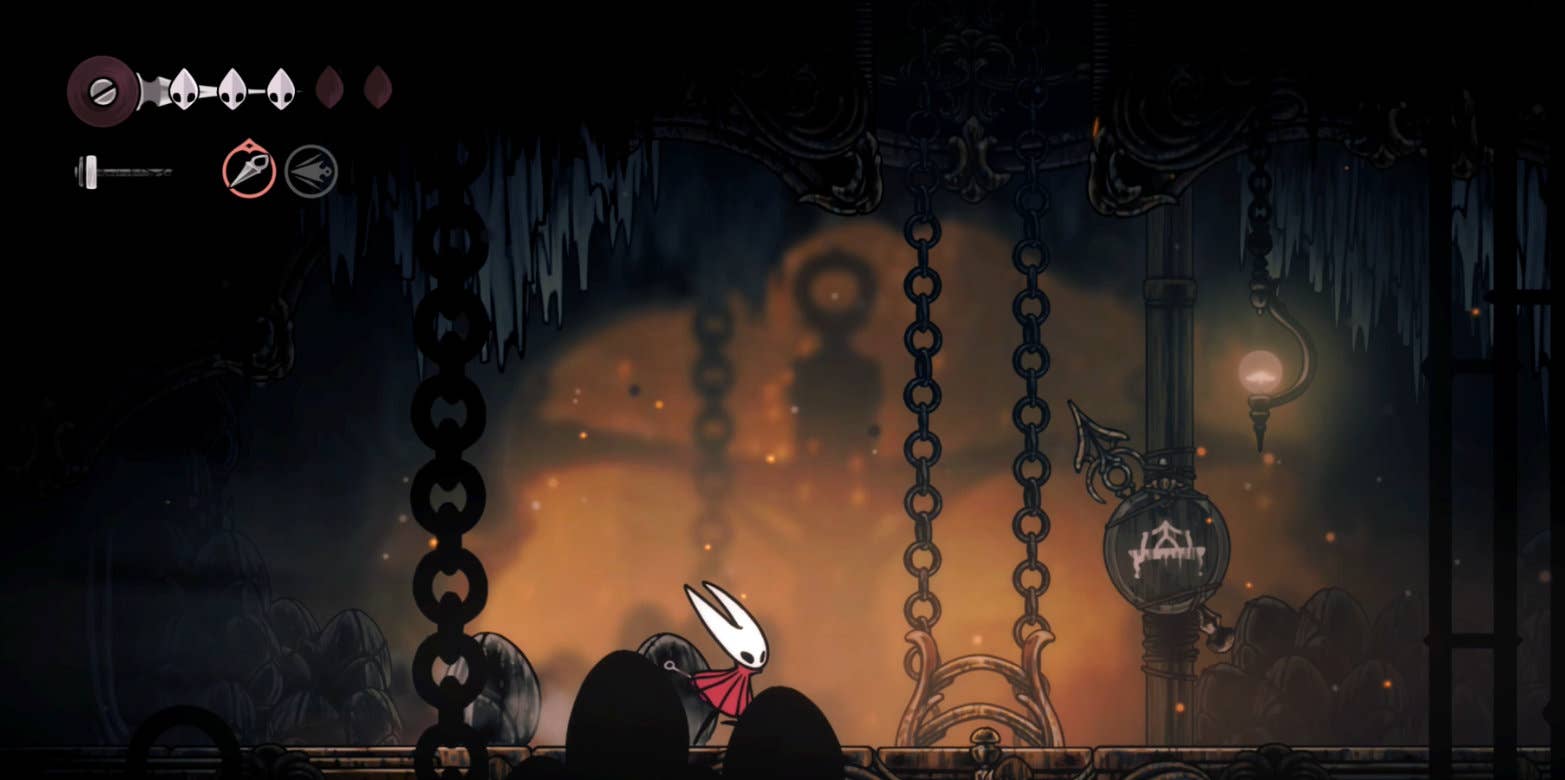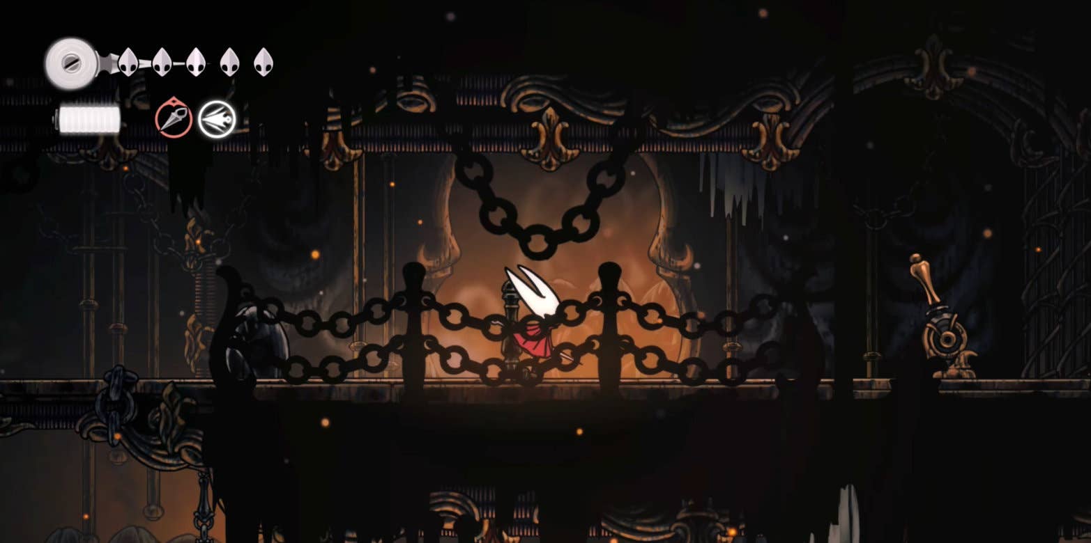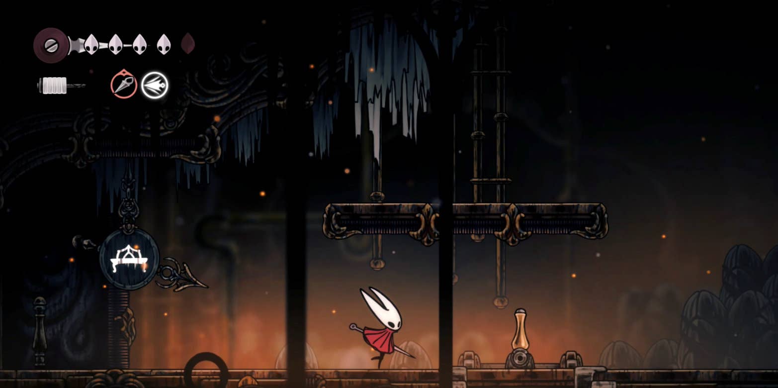 Здесь двигайтесь вправо, пока не сможете спуститься на нижние уровни. Только не забывайте смотреть вниз! Внизу — лава, и если Хорнет упадёт в неё, она потеряет здоровье. Этот участок хорошо знакомит с тем, что вас ждёт в Deep Docks: здесь встречаются два типа врагов и много лавы. Аккуратно идите к двери в конце справа.