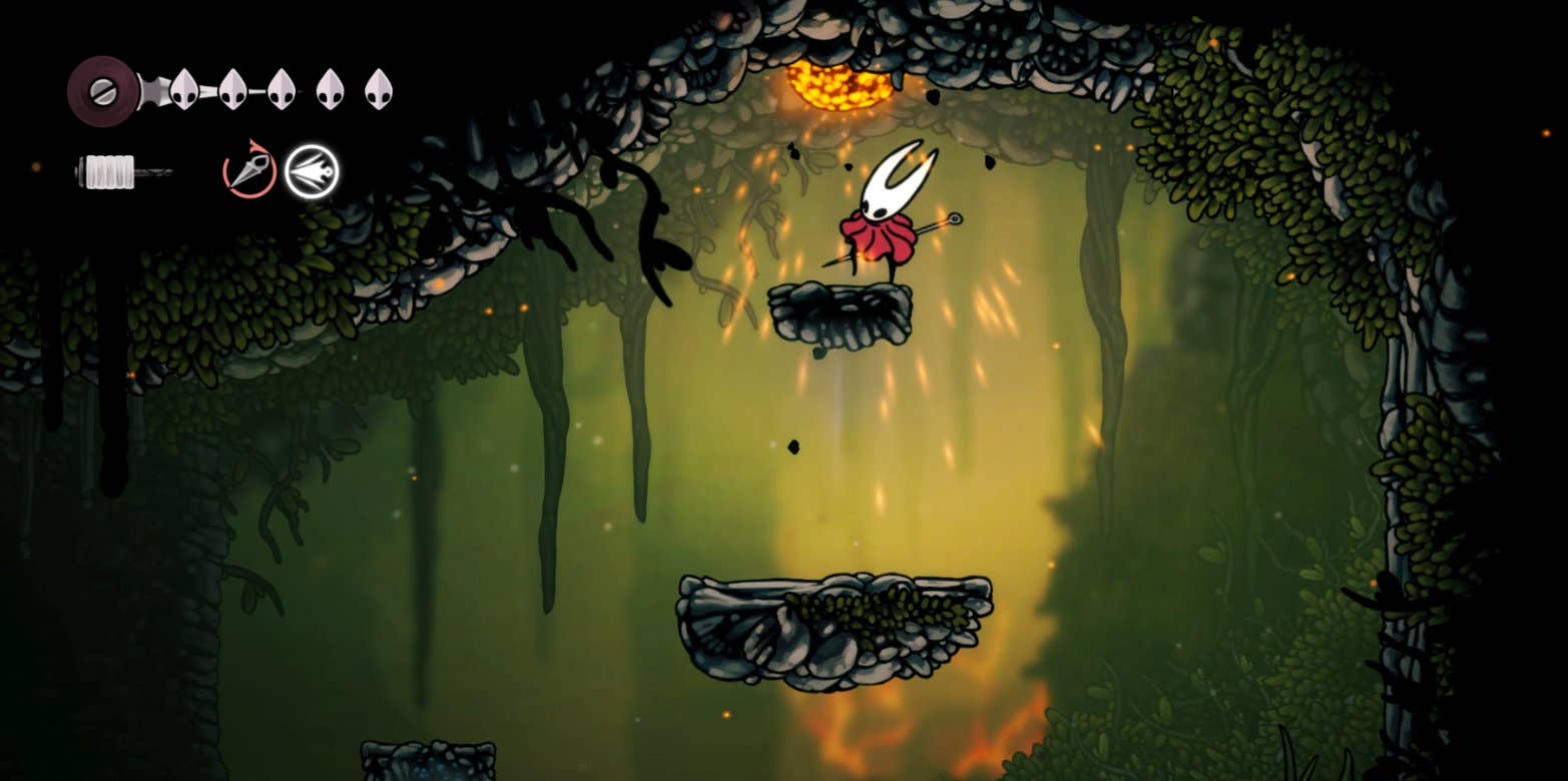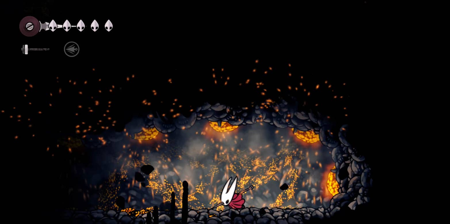 Когда вы достигнете вершины района, где находится Shakra, пройдите через дверь справа. Вы попадёте в область, снова наполненную лавой и врагами. Идите вправо, пока не упрётесь — там вы увидите две платформы, ведущие Хорнет вверх к разрушимой скале в потолке. Ударьте по ней и быстро выберитесь из зоны взрыва, чтобы открыть новый путь.